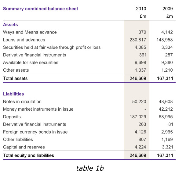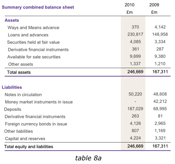 下面的英格蘭銀行2010年年報(bào)的一組信息被分成了兩個(gè)表格,但仍然體現(xiàn)為一個(gè)整體。紫色的表頭清晰的給出了標(biāo)題,標(biāo)題行僅用了一次表頭(2009、2010)和單位(英鎊)。兩個(gè)表格采用同種顏色加粗的字體作為標(biāo)題,清晰而相互獨(dú)立。兩表各自的最后一行也采用了同樣顏色的下劃線。