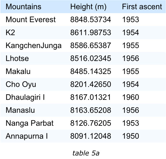 例如:找到最接近8500米的山峰,第二章表格要遠(yuǎn)比第一個(gè)表格容易。山的高度到毫米顯然沒有必要,他使得讀者誤認(rèn)為這些數(shù)據(jù)的確是經(jīng)過精準(zhǔn)測量,然而事實(shí)有可能不是這樣。根據(jù)讀者的需要提供數(shù)據(jù)的準(zhǔn)確程度,并不會(huì)削弱數(shù)據(jù)的有效性。當(dāng)然又少部分人會(huì)質(zhì)疑第二章表格的準(zhǔn)確性,但是大部分人會(huì)想山峰的高度能夠被測量的如此嗎?(山峰每年移動(dòng)的距離就遠(yuǎn)不止于此),甚至還會(huì)對從整體上對數(shù)據(jù)的有效性以及及時(shí)性提出質(zhì)疑。