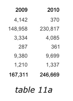 在表格10a和10b中我們已經(jīng)了解到,當(dāng)數(shù)據(jù)處于一列的時(shí)候,人們很容的可以比較數(shù)據(jù)并發(fā)現(xiàn)趨勢。瀏覽者可以快速的從上之下掃描縱向數(shù)據(jù),而對于長距離的橫向數(shù)據(jù),瀏覽就會(huì)遇到困難。然而我們再來看一下表格11a,去掉了所有的裝飾框,當(dāng)我們比較2009年和2010年數(shù)據(jù)的時(shí)候,數(shù)據(jù)橫向擺放要比11b中的上下擺放容易的多。