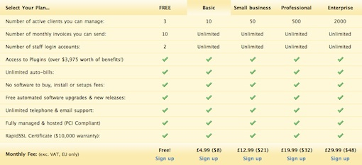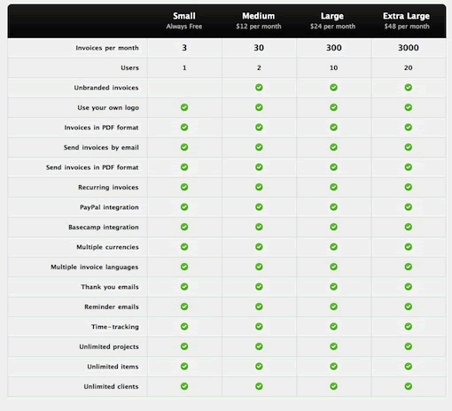 看一下Invoice Machine的例子,表格里除了最上面的三種功能,其他功能的四個條目項都一樣。該表格因此增加了沒有必要的15行。解決方法可以通過一個簡單的公告列表說明“我們的計劃都包括以下功能”,用戶能夠快速看到,他們無論選擇哪個計劃,都會具備這些功能。表格只需要縮短成3-4行,用來顯示不同的部分。我再次重申,表格應(yīng)該讓信息更易讀。如果您的表格不符合這一目標則會適得其反。