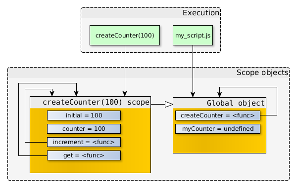 在myCounter.get()運(yùn)行的過程中,作用域鏈最底層的對(duì)象就是get() scope,這是一個(gè)空對(duì)象。所以,當(dāng)myCounter.get()訪問counter變量時(shí),JavaScript在get() scope中找不到這個(gè)屬性,于是就向上到createCounter(100) scope當(dāng)中查找。然后,myCounter.get()將這個(gè)值返回。