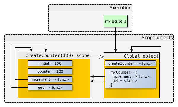 注意increment和get函數(shù)都存有指向createCounter(100) scope的引用。如果createCounter(100)沒有任何返回值,那么createCounter(100) scope不再被引用,于是就可以被垃圾回收。但是因?yàn)?code style="font-size:12px;font-family:'courier new';color:#777777;padding-bottom:1px;padding-top:1px;padding-left:4px;margin:0px 4px;padding-right:4px;background-color:#eeeeee;border-radius:2px;">createCounter(100)實(shí)際上是有返回值的,并且返回值被存儲(chǔ)在了myCounter中,所以對(duì)象之間的引用關(guān)系變成了如下圖所示