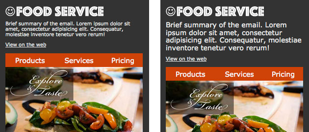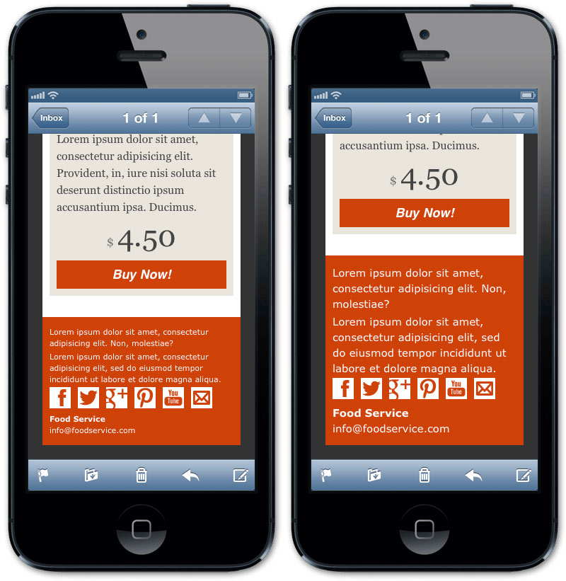 嚴(yán)禁復(fù)雜 —— 尤其是在郵件上。始終避免使用復(fù)雜的結(jié)構(gòu),否則在小屏幕上渲染時(shí)一定會(huì)失敗。請(qǐng)記住許多設(shè)備是不支持媒體查詢的(例如谷歌郵件),所以我們不能指望成熟的內(nèi)容重排技術(shù)。