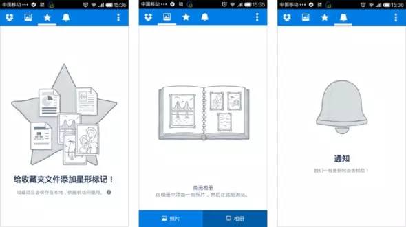 Dropbox是筆者非常喜歡的一款網(wǎng)絡(luò)文件同步工具,產(chǎn)品面臨的問(wèn)題是需要引導(dǎo)用戶上傳內(nèi)容。應(yīng)用在用戶首次使用收藏、相冊(cè)及提醒功能時(shí)通過(guò)灰階加線條風(fēng)格的圖示和淺白的文字說(shuō)明告知用戶如何使用這三個(gè)功能,畫面在保持一貫品牌風(fēng)格的同時(shí)也降低了用戶因?yàn)榱斜韮?nèi)空無(wú)一物而產(chǎn)生情緒上的挫敗感。