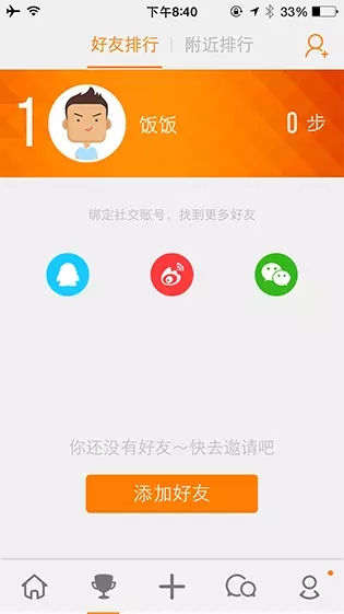 “樂(lè)動(dòng)力”的好友排行頁(yè)面,在沒(méi)有添加過(guò)好友的情況下,該頁(yè)面展示了一些社交網(wǎng)絡(luò)的圖標(biāo)和大大的添加按鈕提示用戶可以通過(guò)綁定社交賬號(hào)來(lái)找到更多好友一起PK運(yùn)動(dòng)量。