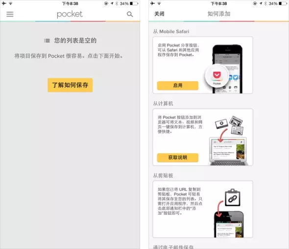 Pocket是一個(gè)可以讓用戶把內(nèi)容(文字、圖片甚至視頻)一鍵保存下來(lái),用于其他時(shí)間完成閱讀的工具。在初次使用時(shí)它的列表頁(yè)面內(nèi)沒(méi)有內(nèi)容時(shí),會(huì)顯示一個(gè)“了解如何保存”的按鈕,點(diǎn)擊可以詳細(xì)了解添加列表的各種方法。