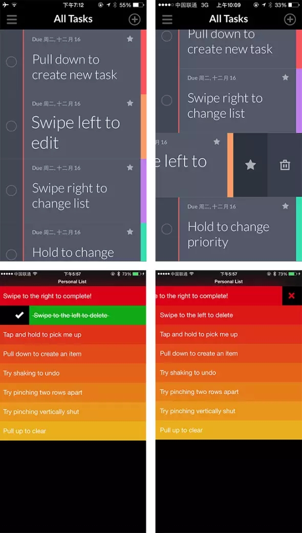 Taasky和Clear作為兩款交互優(yōu)秀的任務(wù)應(yīng)用,都擁有非常豐富手勢(shì)操作,它們沒(méi)有像別的軟件一樣在界面上加遮罩、標(biāo)注做出冗長(zhǎng)的用戶教育頁(yè),而是直接將操作指引嵌在一條條的任務(wù)里,用戶只要跟著當(dāng)前任務(wù)的簡(jiǎn)單描述滑動(dòng)屏幕就能了解全部手勢(shì)操作,即充實(shí)了原本空白的缺省頁(yè)面又很自然地指導(dǎo)用戶如何使用該軟件。
