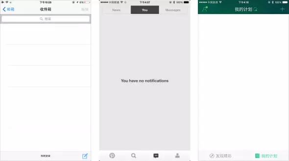 缺省頁(yè)面,是出現(xiàn)在用戶沒(méi)有提交任何資料或者網(wǎng)絡(luò)連接不通暢的情況下所展現(xiàn)的頁(yè)面。通常設(shè)計(jì)師們習(xí)慣用豐富的數(shù)據(jù)內(nèi)容把頁(yè)面設(shè)計(jì)得美觀實(shí)用,考慮的都是界面展現(xiàn)的“理想狀態(tài)”,往往會(huì)忽視沒(méi)有內(nèi)容的“缺省狀態(tài)”。未經(jīng)過(guò)精心設(shè)計(jì)的缺省頁(yè)面降低了用戶的使用體驗(yàn),并可能給用戶帶來(lái)困擾,如下圖iOS系統(tǒng)郵件App,無(wú)郵件時(shí)界面上沒(méi)有任何有效反饋信息,用戶不能明確得知到底是網(wǎng)絡(luò)問(wèn)題還是賬號(hào)同步出錯(cuò)亦或者是收件箱內(nèi)確實(shí)一封郵件都沒(méi)有。同樣的情況也出現(xiàn)在Pinterest和出發(fā)吧的界面里。