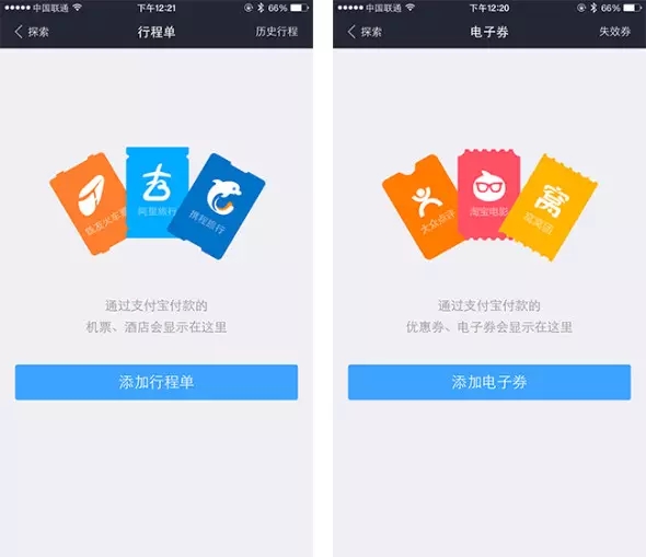 支付寶錢包的電子券和行程單頁(yè)面通過(guò)票據(jù)圖形+文字清楚地說(shuō)明該分類下會(huì)出現(xiàn)什么內(nèi)容,并在屏幕下方提供添加票據(jù)的按鈕。