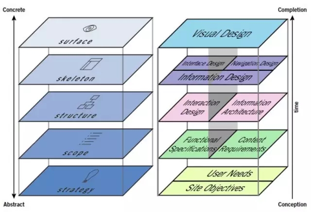 想了解 UI/UX,就一定要了解這張圖,這是 Jesse James Garrett 在2000年發(fā)表的用戶經(jīng)驗元素一書中所提出:使用者的經(jīng)驗可分成抽象到具體,也就是由策略、范圍、結構、骨架、表層所構成。