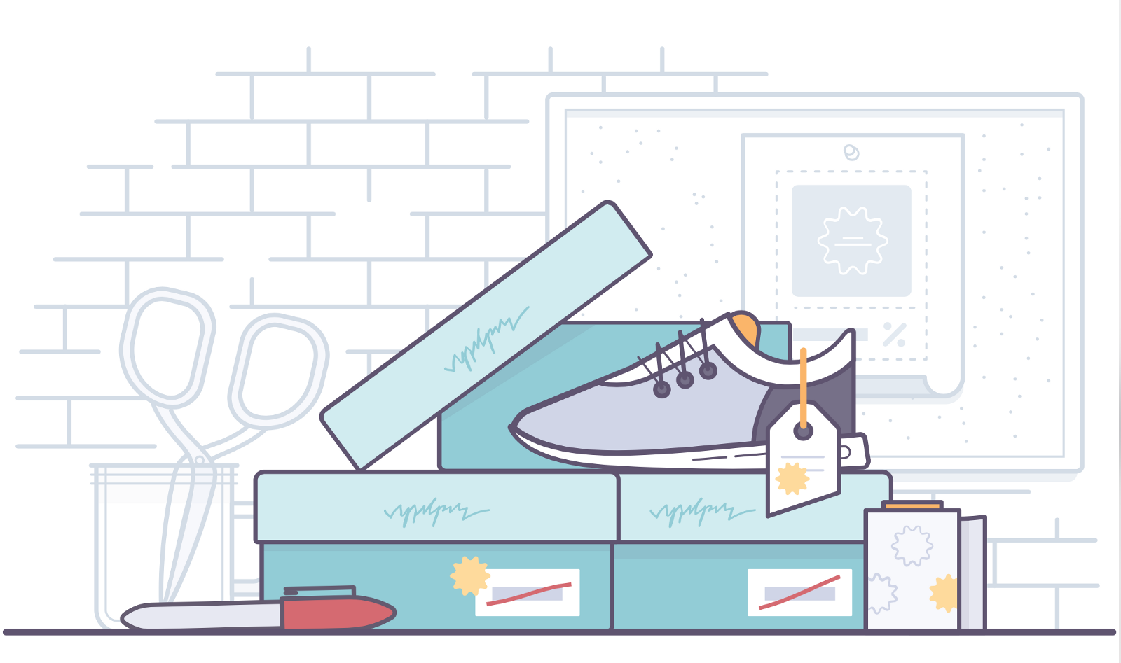 這個元素在線上和線下有相似之處。盡管我不認(rèn)為它是一類比喻,但在產(chǎn)品設(shè)計中我還是將它單獨拿出來說。比喻常用來展現(xiàn)觸動人心的部分,那是一件事情或者一個行動產(chǎn)生的積極感覺。不過,對于內(nèi)容傳遞給用戶的方式,團隊更傾向于中立的寫實表達。不必告訴用戶我們的感受如何,只需簡潔傳達信息。用插畫的專業(yè)術(shù)語來表達則是:我們只愿意通過繪制寫實狀態(tài)下的物品,來幫助用戶理解線上的內(nèi)容。當(dāng)然,談到產(chǎn)品時,我們大多是在電腦上作畫,比如,你可以繪制20多個互相連接的空狀態(tài)頁面,來表達重復(fù)性。這也是我們在為用戶傳達內(nèi)容時增加的一種類比方式。比如下圖的例子,線上電子商務(wù)可以讓用戶通過優(yōu)惠碼輸入實現(xiàn)折扣,那么線下實體銷售折扣該如何表達呢?可能是一堆貼紙和帶著折扣價格的紅色標(biāo)記。我們能借助全新懷舊風(fēng)格的插畫為用戶帶來愉悅,同時還能保持中立,只是簡單清晰的表達信息。