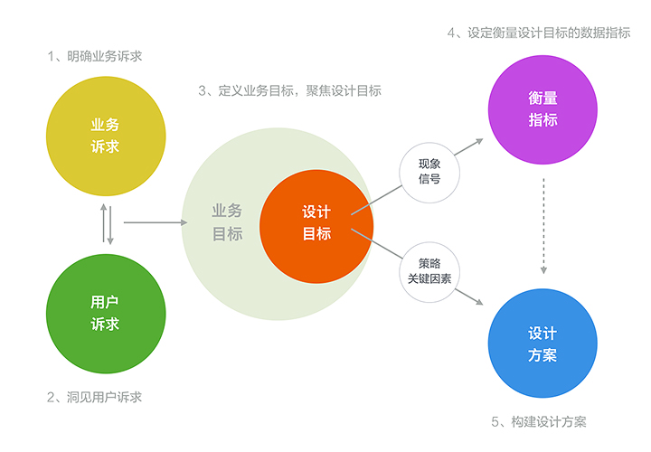 明晰了底層世界觀后,我們團(tuán)隊(duì)逐層向上累積出了我們的方法論,包括thinkflow,workflow,等等,其中最具有代表性的就是剛才提到的《五導(dǎo)家》。五導(dǎo)家是一種設(shè)計崗位的思考過程方法論,它包含一個以目標(biāo)用戶為源頭的5步驟思考路徑,及相關(guān)方法和原則,通過深度解構(gòu)+全鏈路串聯(lián)的方式,總結(jié)和表達(dá)作為職能部門的UED團(tuán)隊(duì)在設(shè)計工作中思考路徑的普遍規(guī)律,力爭將原來那些模糊、零散的概念信息(如業(yè)務(wù)訴求、用戶訴求、業(yè)務(wù)目標(biāo)等)及思考環(huán)節(jié)(如何從訴求到目標(biāo),如何從目標(biāo)到指標(biāo),如何從目標(biāo)到方案等)進(jìn)行串聯(lián)和體系化。
