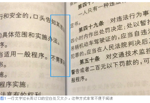 在設(shè)計工作中,如果有100個人就會有100種設(shè)計理論,我認為并不能總結(jié)出一條絕對正確的理論。但是,如果完全沒有什么設(shè)計理論的話,貌似會使設(shè)計顯得很奇怪。比如,經(jīng)常會看到這種書籍(圖1),一行文字過長而訂口的空白又處理得不太合適。只要看到這樣的設(shè)計,馬上就會想到“這里好像沒有規(guī)則啊”,還會讓人產(chǎn)生“這本書的設(shè)計師好像不讀書啊”這樣的感覺。在閱讀過程中哪怕只有一些地方令人難以理解,也會讓人精神不集中,不能徹底關(guān)注文章本身。如果是一個讀書的人,他自己看看這樣的設(shè)計,自己也會感到這種方式不便于閱讀啊。所以我認為電子書的閱讀感受也是這樣,要做出理想的版面,作為設(shè)計者需要站在讀者的角度考慮,應(yīng)該尋找對于自己來說便于閱讀的排版。因此,也借此機會來整理出網(wǎng)易云閱讀產(chǎn)品中,書籍正文文字排版的相關(guān)規(guī)則。