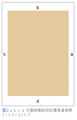 首先在書籍編排過程中,設(shè)定頁面四周的余白來安排頁面的排版。頁邊空白的大小不同,排版效果給讀者帶來的印象也會發(fā)生變化,因此需要適當?shù)剡M行處理。雖然紙質(zhì)書籍已經(jīng)有了莫里斯所提倡的版面設(shè)定理論,但是這些理論并不適合于顯示在硬件設(shè)備上。因此我們需要根據(jù)不同的媒體特點來進行處理。如圖(2) 有顏色的部分是版面,abcd版面標準的設(shè)定通常是按照1:1.2:1:1.7的比例來進行設(shè)計。