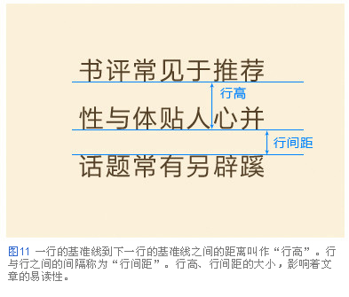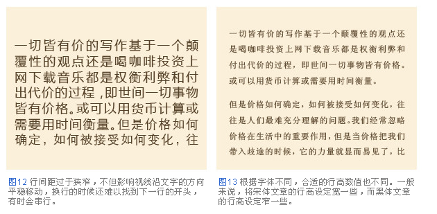 行高,行間距的大小對文章的易讀性有很大的影響。行與行之間拉得過開,從一行末尾移動到下一行開頭,視線的移動距離過長增加了閱讀難度。相反,行與行之間貼得過緊,上下挨得過緊影響了視線的移動,讓人不知道正在閱讀哪一行(圖12)。正文最恰當?shù)男懈撸緫?yīng)該設(shè)定為其文章中文字大小的兩倍。例如文字大小為8px的文章,就應(yīng)該把行高設(shè)定為16px(圖13)