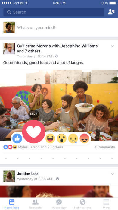 Facebook中好友的每條動(dòng)態(tài)都是以一張卡片的形式展現(xiàn)的。用戶可以很快的完成對(duì)頁面信息的讀取。你可以不斷的往下滑查看更多的好友動(dòng)態(tài)。你也可以看到多少人點(diǎn)贊,多少人評(píng)論與分享。這些功能誘導(dǎo)用戶積極參與互動(dòng),增加傳播性。