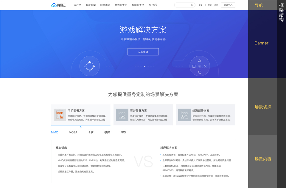 (如下圖所示為常見網(wǎng)頁形態(tài)結(jié)構(gòu),整個頁面UI開發(fā)同學(xué)需要得到的其實是設(shè)計師確認的框架結(jié)構(gòu),至于里面的圖標、banner配圖、抑或是文字內(nèi)容都是可以后面提供的。具體來說,如下圖中,場景切換部分為三分陣列版式,灰色方框為圖標占位預(yù)留,UI開發(fā)同學(xué)只需要圖標占位尺寸即可,圖標細節(jié)和形態(tài),設(shè)計師在后面完成整體頁面框架后-上線前補齊即可。)