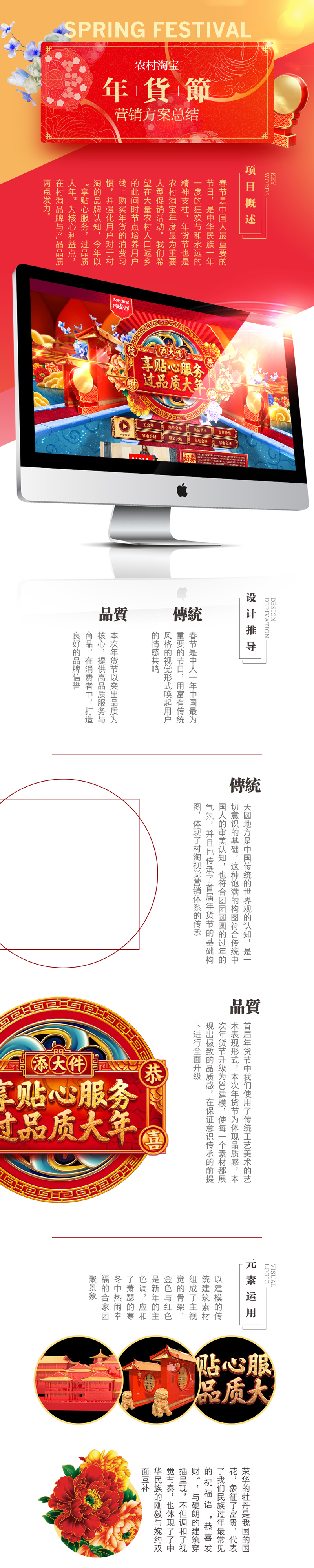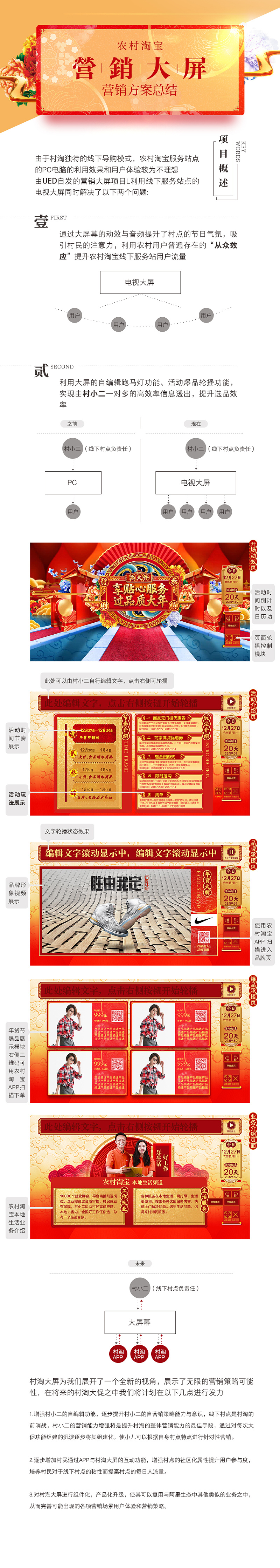 元旦已立,新春即臨,這是中國(guó)人最重要的傳統(tǒng)節(jié)日,也代表了農(nóng)村淘寶年度最為重要大型促銷(xiāo)活動(dòng)年貨節(jié)的即將上線(xiàn)。我們?cè)诒敬未蟠僦谐送瓿沙R?guī)的需求之外也進(jìn)行了多項(xiàng)創(chuàng)新性嘗試與自發(fā)的創(chuàng)新項(xiàng)目,包括針對(duì)線(xiàn)下?tīng)I(yíng)銷(xiāo)場(chǎng)景特點(diǎn)的視頻制作,創(chuàng)新大屏的全新功能上線(xiàn)等等。