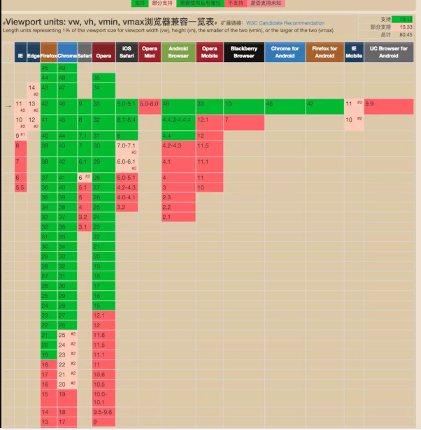 vw這個vw的方案,相當(dāng)而言還比較新。vw 即(viewport width)可視窗口的寬度。之所以把這個方案放在后面來說,是因?yàn)関iewport在去年(2017年)的時候存在不少的兼容性問題,各個瀏覽器的支持并不是很好。但是來到了2018年這個時間點(diǎn),viewport單位意見得到了眾多瀏覽器的支持(80.45%)。