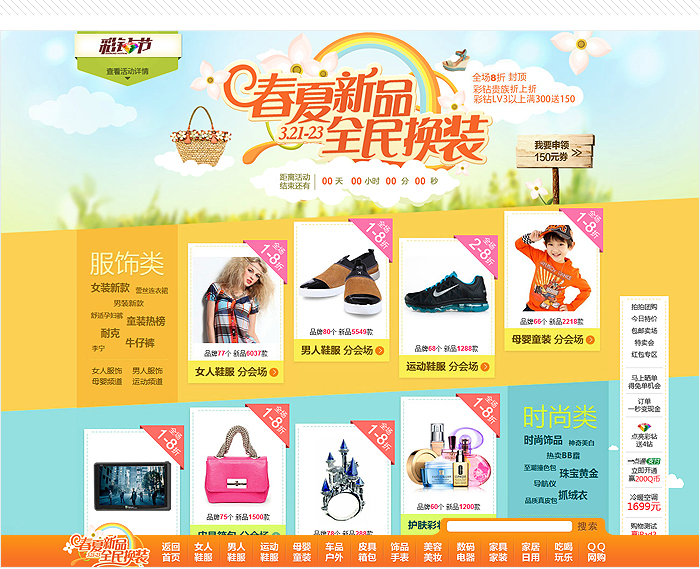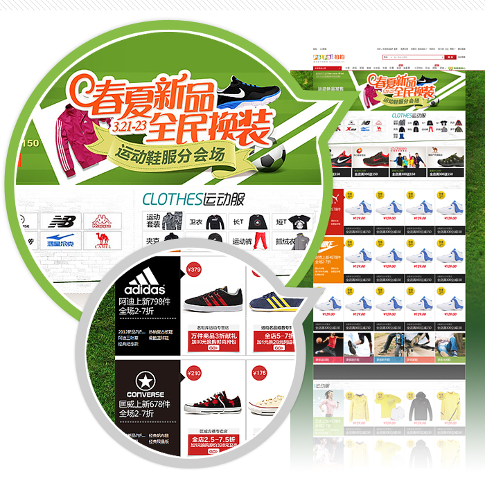 拍拍3月的大型促銷活動(dòng)《春夏新品,全民換裝》,主會(huì)場(chǎng)設(shè)計(jì)上運(yùn)用明快、鮮艷的春夏色彩塊組合,在細(xì)節(jié)上采用花朵草地藍(lán)天更加突顯初春購物的輕松氛圍。并在活動(dòng)頭部主畫面中采用HTML5+CSS3實(shí)現(xiàn)的酷炫動(dòng)畫,為用戶帶來了全新的頁面體驗(yàn)。