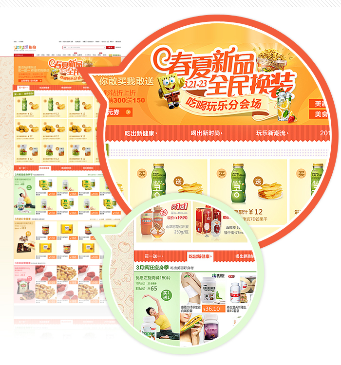 3月促食品分會(huì)場(chǎng)運(yùn)用鮮明的色彩,大背景采用不同食品線稿大小不一、層次分明的組合,渲染出美食熱鬧的氛圍,從而提高消費(fèi)者的購買欲望
