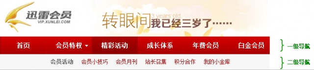 設(shè)計(jì)中使用近似的文本、顏色、圖像和留白等,可以更好的區(qū)分各個(gè)模塊。如下圖中迅雷會(huì)員導(dǎo)航,通過(guò)相似原則我們很容易的將一級(jí)導(dǎo)航和二級(jí)導(dǎo)航區(qū)分開來(lái)。