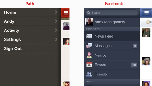 Path和Facebook的app界面,即使右側(cè)只顯示一小部分內(nèi)容,而用戶卻能感知到后面更多的內(nèi)容,并能將導(dǎo)航和內(nèi)容輕易的聯(lián)系起來(lái)。