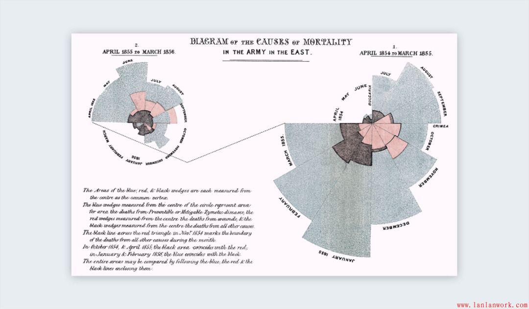 1857年,英國護(hù)士佛羅倫斯·南丁格爾使用信息圖形,說服維多利亞女王改善軍隊(duì)醫(yī)院的條件。她的圖表顯示了克里米亞戰(zhàn)爭(zhēng)每個(gè)月的死亡人數(shù)和原因:可預(yù)防的藍(lán)色疾病,紅色傷口和其他黑色病因。