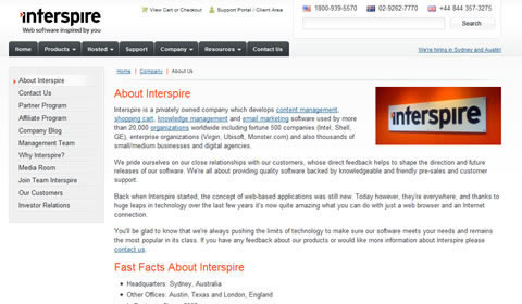 當(dāng)你在設(shè)計(jì)中克制而明智地使用色彩時(shí),吸引訪(fǎng)客對(duì)重要項(xiàng)目的注意力就變得相當(dāng)容易。在 Interspire 的 “About Us(關(guān)于我們)” 頁(yè)面中,訪(fǎng)客的注意力被迅速吸引到頁(yè)面頂部LOGO那紅色的一點(diǎn)上,然后是標(biāo)題,然后是頁(yè)面右邊的LOGO照片。
