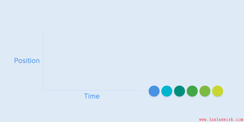 所有的APP動(dòng)畫都會(huì)用到動(dòng)畫曲線。我將試著去解釋如何閱讀它們并說明它們的含義。下面的例子中,運(yùn)動(dòng)就是勻速的,可以看到對(duì)象在相同的時(shí)間間隔中移動(dòng)了相同的位置。