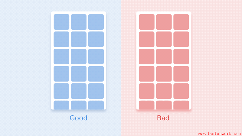 至于表格視圖,就會(huì)略微有些復(fù)雜。這種情況下,用戶往往是以對(duì)角線為焦點(diǎn)去看界面的,所以逐個(gè)出現(xiàn)的形式也比較糟糕。另外,逐個(gè)出現(xiàn)的動(dòng)畫在時(shí)間上也會(huì)過長(zhǎng),而且把用戶的注意力引導(dǎo)成鋸齒狀,這是很不友好的。