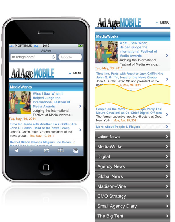 確實(shí)是這么回事。移動(dòng)版本的站點(diǎn),在布局方面,應(yīng)該使主要內(nèi)容盡量多的占據(jù)著首屏當(dāng)中的空間,而導(dǎo)航結(jié)構(gòu)則應(yīng)該以某種縮略的形式出現(xiàn)在相對(duì)次要的位置。Wroblewski通過(guò)一個(gè)實(shí)例來(lái)倡導(dǎo)這個(gè)設(shè)計(jì)模式,也就是Ad Age的移動(dòng)版站點(diǎn) 。其首屏當(dāng)中,除了網(wǎng)站標(biāo)題及內(nèi)容列表之外,右上角的菜單按鈕是界面當(dāng)中唯一一個(gè)交互控制元素。當(dāng)用戶點(diǎn)擊這個(gè)按鈕時(shí),導(dǎo)航列表才會(huì)出現(xiàn)在屏幕當(dāng)中??瓷先?,整個(gè)導(dǎo)航列表好像是另外一個(gè)界面,但它實(shí)際上是被放置在頁(yè)面最下方的,而菜單按鈕只是個(gè)錨點(diǎn)而已。