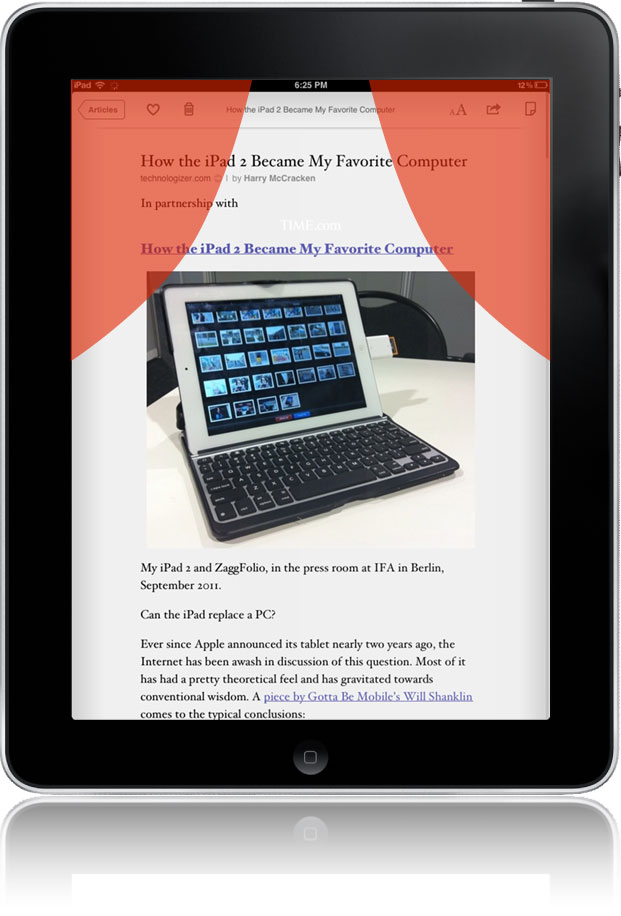 所以,與手機(jī)界面不同,在iPad及同類平板設(shè)備的應(yīng)用當(dāng)中,主要的交互控制對(duì)象應(yīng)該被放置在界面的左上角或右上角,以便拇指可以很容易的觸摸到。Instapaper和Twitter在這方面做的都不錯(cuò):