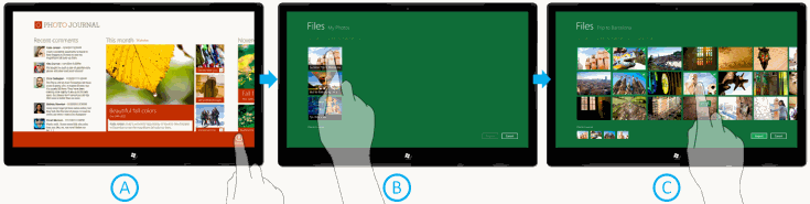 無論在iOS還是Windows中,這兩個(gè)手勢在很多時(shí)候都被用作放大或縮小內(nèi)容對(duì)象的尺寸。不過對(duì)于Metro應(yīng)用來說,它們還可以通過Semantic Zoom來實(shí)現(xiàn)內(nèi)容層級(jí)間的導(dǎo)航。用戶可以捏合某個(gè)內(nèi)容對(duì)象,來進(jìn)入它所在的相關(guān)內(nèi)容組。不過,當(dāng)用戶正在以全屏模式瀏覽單張相片的時(shí)候,捏合與張開的手勢還是會(huì)被用來調(diào)整圖片的尺寸。
