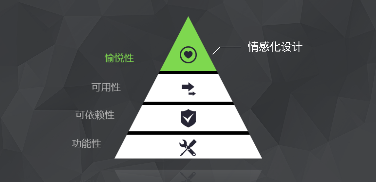 《情感化設(shè)計心理學(xué)中》作者唐納德·諾曼將情感化設(shè)計與馬斯洛的人類需求層次理論聯(lián)系了起來。 產(chǎn)品特質(zhì)也可以被劃分為功能性、可依賴性、可用性和愉悅性這四個從低到高的層面,而情感化設(shè)計則處于其中最上層的“愉悅性”層面當中。