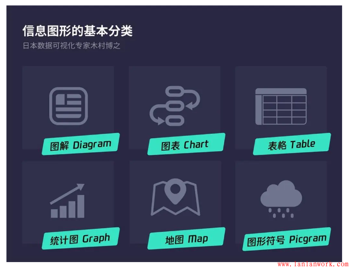 根據木村博之的定義,從視覺表現形式的角度,將「信息圖表」的呈現方式分為六大類:圖解(Diagram)、圖表(Chart)、表格(Table)、統計圖(Graph)、地圖(Map)、圖形符號(Pictogram)。