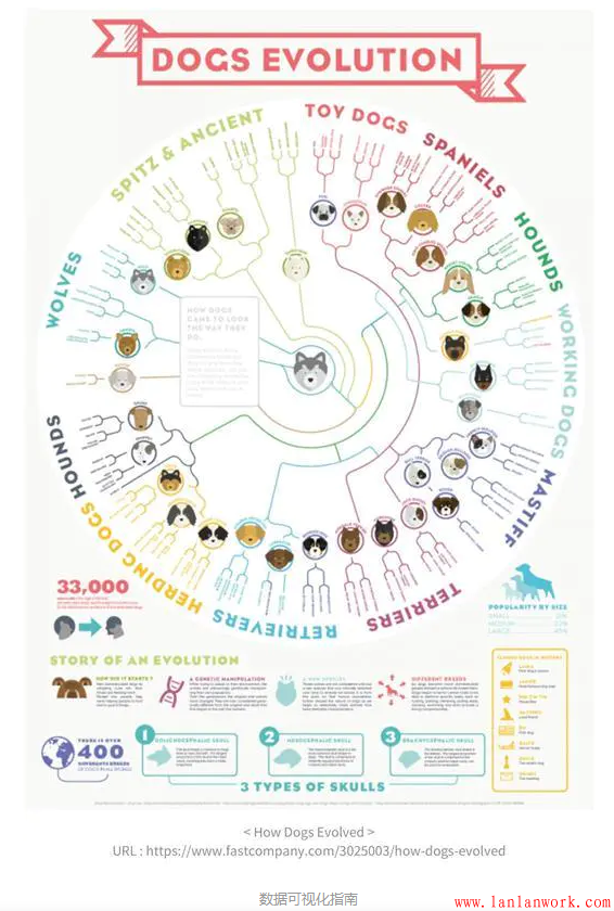 下圖是一張寵物狗的進化圖,用巧妙的方式清晰地向我們傳遞了,狼是如何被人類馴化成不同種類的寵物狗的。