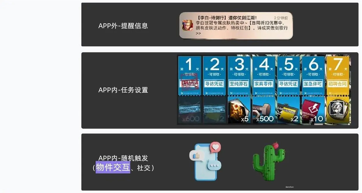 這點和常規(guī)做產品的觸點很類似,雖然是做教育產品,但其本質還是產品。因此用產品的思路,在用戶未進入產品時,用 APP 推送等方式提醒用戶上線;而在進入產品內,在主線上,以任務的方式督促用戶學習,同時增加一些隨機觸發(fā)的學習任務,提升學習行為觸發(fā)的觸點。