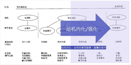 回歸到自我決定理論來看,大部分學生都處在非自我決定的階段,以無動機或外在動機的外部調節(jié)和內投調節(jié)為主,他們對學習沒有動機,很難堅持。從動機側來看,我們要做的是把學生的動機內化/強化,去提升學習效率和學習效果的提升。