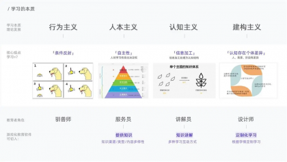 學習本質的理論基礎經過了 4 個時期的發(fā)展,從行為主義、人本主義、認知主義再到建構主義,對于教育者/方的要求越來越高。