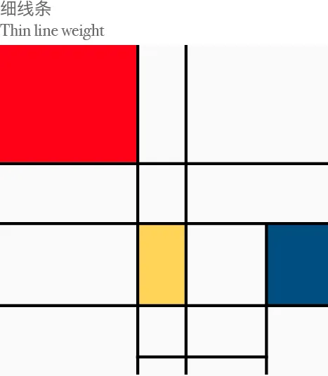 serif字體本身的線條的粗細(xì)變化和平衡就跟中國書法一樣,好的書法作品是不可能每條線都一樣粗細(xì),一定是交織的平衡。人類的視覺本身對不同線寬的交錯(cuò)就有著美的感覺。比如下圖最左邊是蒙德里安在”新造形主義”﹝Neo-Plasticism﹞里的作品,其中每個(gè)交叉的線條都有著不同的粗細(xì)。如果將同樣這幅畫的線條變成同等粗細(xì),那這件作品的性格就淡了。同樣根據(jù)人自然的審美觀,細(xì)線條比粗線條要美,比較第二和第三張就能看出來