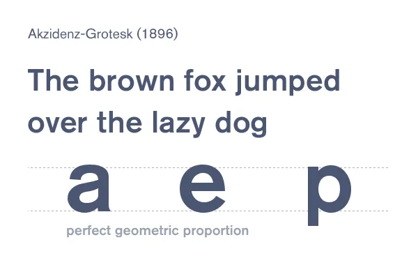 Akzidenz-Grotesk 起于1896年,受到很多字體的影響,從Baskerville, Garamond和Carlson中繼承了幾何比例的影響,將其發(fā)展到了新的一級。當(dāng)代的Akzidenz-Grotesk字體遺傳于20世紀(jì)50年代后期,它已經(jīng)是被擴(kuò)大后的字體族,這些風(fēng)格到后來啟發(fā)了更加現(xiàn)代的Helvetica,和Univers。