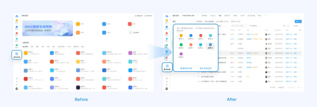 鼠標(biāo)懸浮時(shí),它就像一個(gè)傳送門一樣將用戶需要切換的應(yīng)用呈現(xiàn)在浮層卡片上,用戶點(diǎn)擊所需的應(yīng)用即可完成應(yīng)用的切換。