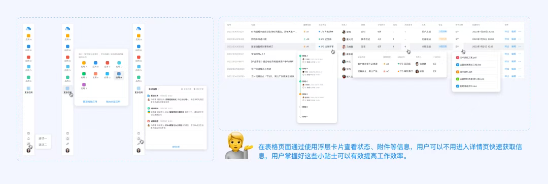 在表格頁面通過使用【浮層卡片】查看狀態(tài)、附件等信息,用戶可以不用進(jìn)入詳情頁快速獲取信息,用戶掌握好這些小貼士可以有效提高工作效率。