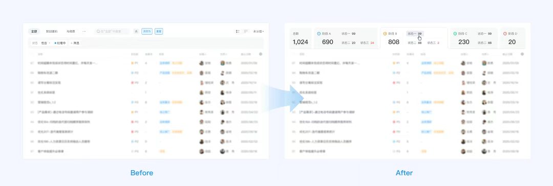 我們最初使用了數(shù)據(jù)可視化的看板來呈現(xiàn)各階段下不同狀態(tài)的概覽信息,但這只解決了數(shù)據(jù)概覽的問題,用戶還是需要點(diǎn)擊“詳情”才能跳轉(zhuǎn)至相應(yīng)的頁面。