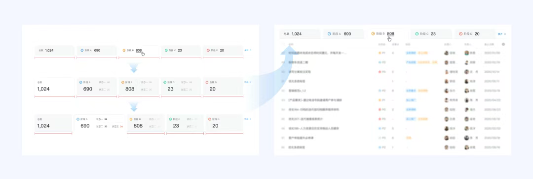 體驗(yàn)設(shè)計(jì)師在一些項(xiàng)目中嘗試了將數(shù)據(jù)可視化看板與Tab標(biāo)簽頁的融合,這就形成了具有Tab切換功能的數(shù)據(jù)看板,用戶在查看概覽數(shù)據(jù)的同時(shí)也可以通過點(diǎn)擊切換查看各階段/狀態(tài)下的詳細(xì)數(shù)據(jù)。