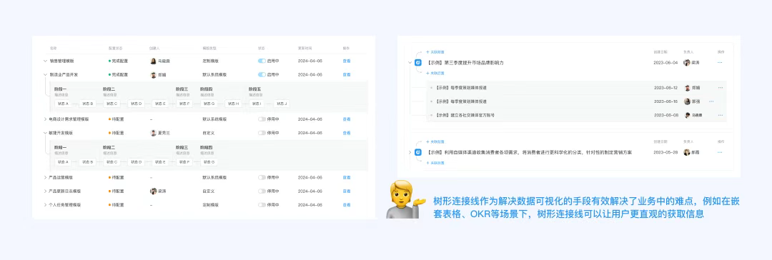 樹形連接線作為一種解決數(shù)據(jù)可視化的手段有效解決了業(yè)務(wù)中的難點(diǎn),同樣設(shè)計(jì)團(tuán)隊(duì)也將其拓展到了更多適用場景,幫助用戶提升信息查看和操作效率。