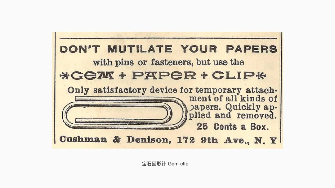 1899 年,威廉·米德爾布魯克(William D. Middlebrook)獲得了回形針制造機械的設(shè)計專利,隨后他將專利賣給了一家辦公用品制造商,該公司將其注冊為“寶石回形針”(Gem clip)。其有著標(biāo)志性的雙橢圓形環(huán)圈設(shè)計,通常采用鍍鎳或彩色塑料包裹的材質(zhì),不僅有效防銹,也兼顧外觀的美感。