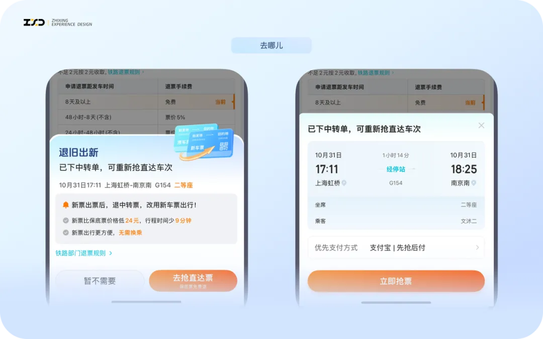 用當(dāng)前的中轉(zhuǎn)作為保底,先搶票,搶到了還能再退票。讓用戶安心下單,在未搶到心儀票的時候能有中轉(zhuǎn)的替補票,可以緩解用戶的焦慮情緒,有兜底的保障安全感