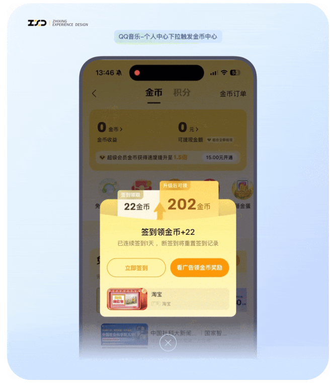 用 “金幣” 作為即時激勵,滿足用戶即時反饋的心理需求,驅(qū)動次日復(fù)訪,同時聯(lián)動積分體系,將單次簽到轉(zhuǎn)化為長期行為